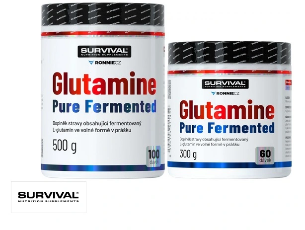 Glutamine Pure Fermented značky Survival nabízí 500gramové a/nebo 300gramové cenově velmi výhodné balení volné formy této semiesenciální aminokyseliny, kterou je zvlášť vhodné používat bezprostředně po tréninku a také večer před spaním. Lze používat v kombinaci s jinými doplňky sportovní výživy.